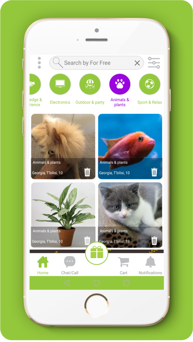 You can give away or receive animals and plants, as well as the items intended for them for free from this page.